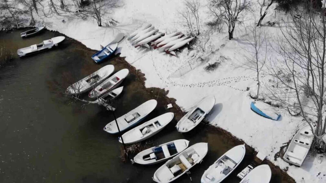 İstanbul’da etkili olan kar yağışının ardından Terkos Gölü’nde oluşan kartpostallık kar manzarası dron ile görüntülendi.