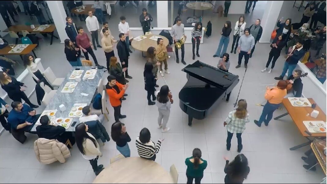 Yüzlerce öğrencinin aynı anda yemek yediği salonda önce piyano sesi duyuldu.