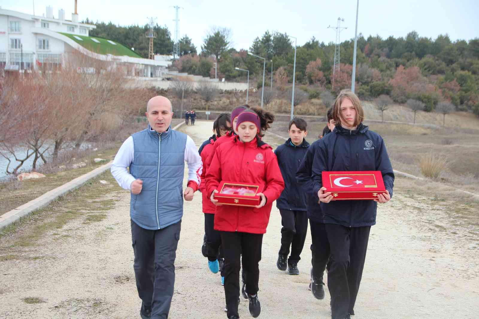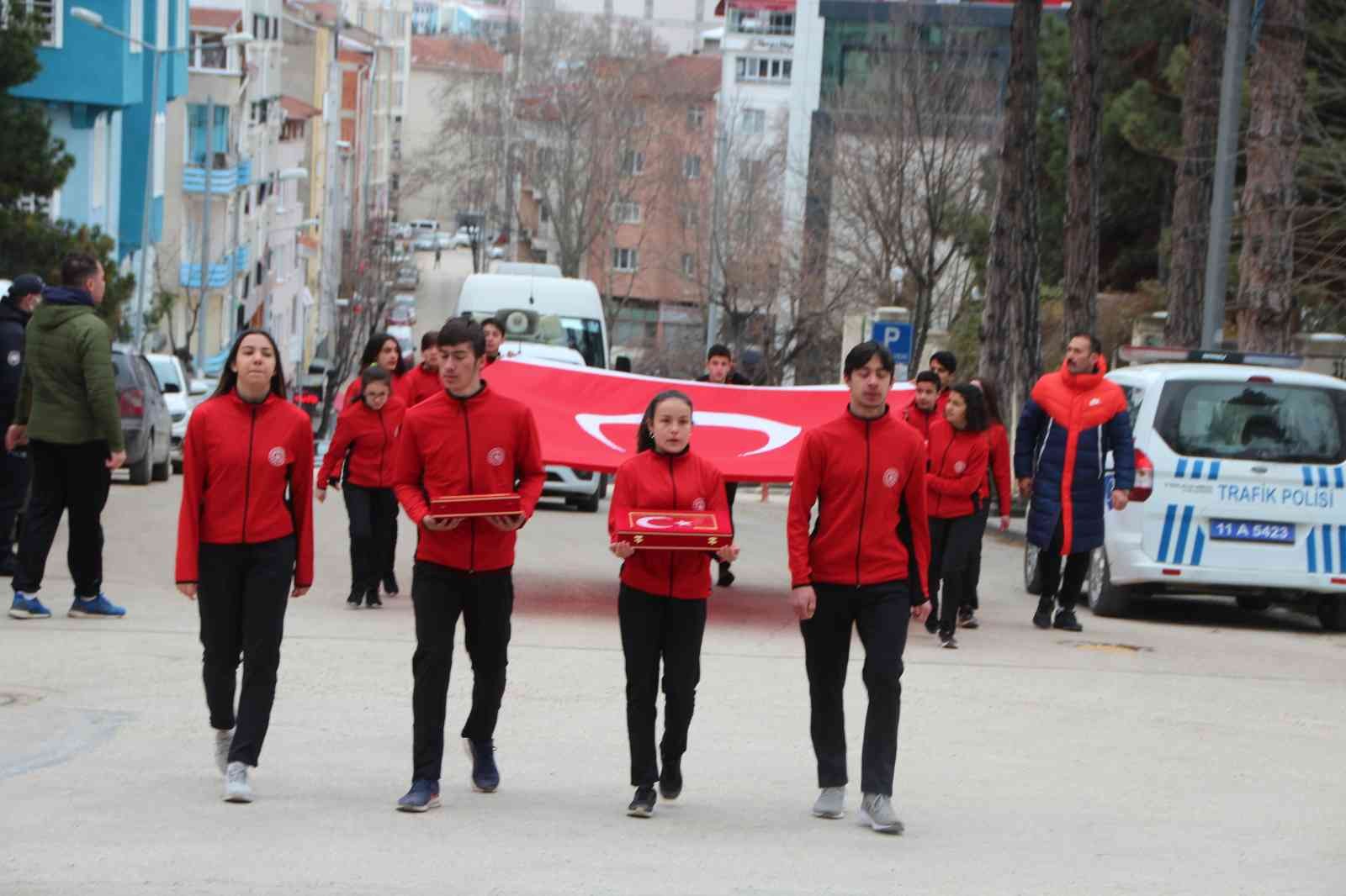 Çanakkale Deniz Zaferi‘nin 107’inci yıldönümü dolayısıyla Cumhurbaşkanı Recep Tayyip Erdoğan’a teslim edilmek üzere önceki gün Gelibolu Yarımadası‘nda 253 bin şehidin bulunduğu bölgeden alınan toprak, deniz suyu ve Türk Bayrağı‘ndan oluşan kutsal emanetler, Bilecikli atletlere teslim edildi.