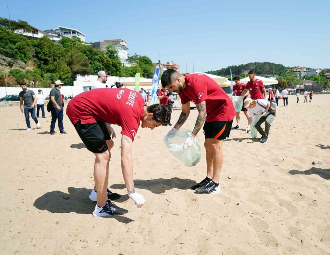 5-11 Haziran tarihleri arasındaki Çevre Koruma Haftası’nın önemine dikkat çeken milli futbolcular, etkinlikte eldivenlerini takarak, sahilde 30 dakika boyunca atıkları topladı.