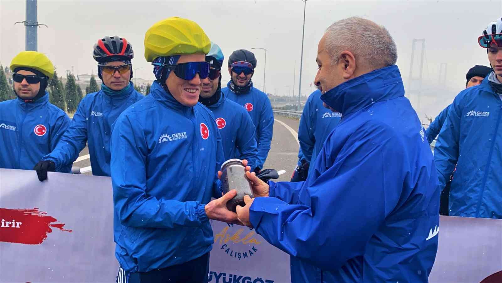Kocaeli’nin Gebze ilçesinde 18 Mart Çanakkale Zaferi ve Şehitleri Anma günü kapsamında anlamlı bir program düzenlendi. Şehitleri anmak için yola çıkan 24 bisikletli sporcu, Gebze’den aldıkları vatan toprağı ve Türk bayrağını, Çanakkale Şehitlik Abidesi’ne teslim edecek. Osmangazi Köprüsü’nün ayaklarından heyecanla bisikletlerine binen sporcular, bu anlamlı vazife için 420 kilometre boyunca pedal çevirecek. Gebze Belediye Başkanı Zinnur Büyükgöz, şehitleri anmak için zorlu hava şartlarında yola çıkan sporculara vatan toprağını ve Türk bayrağını emanet ederek, onları uğurladı.