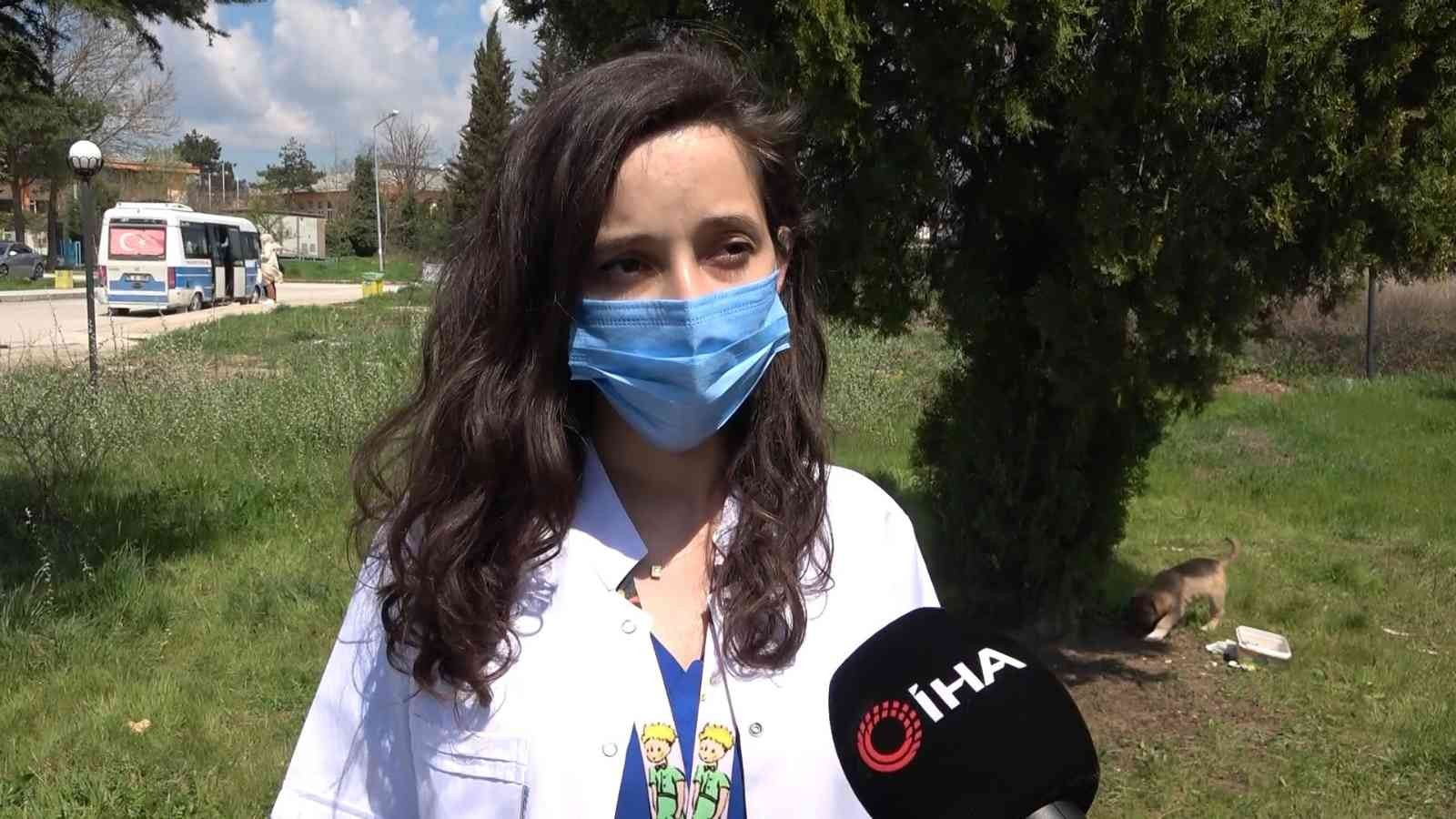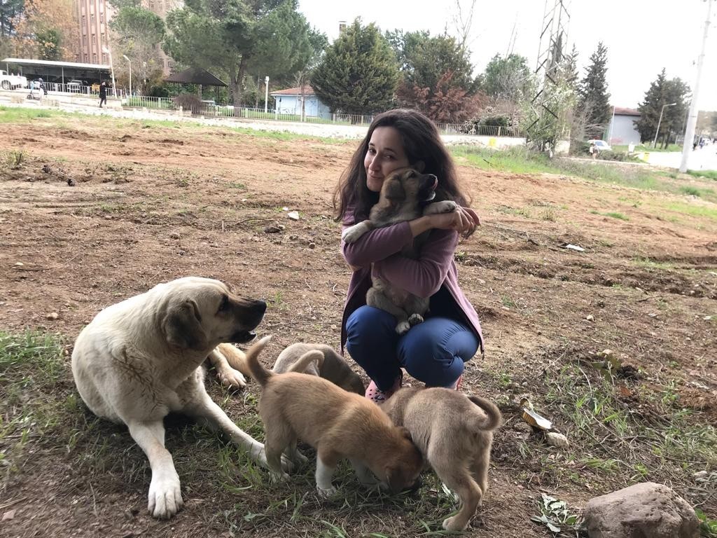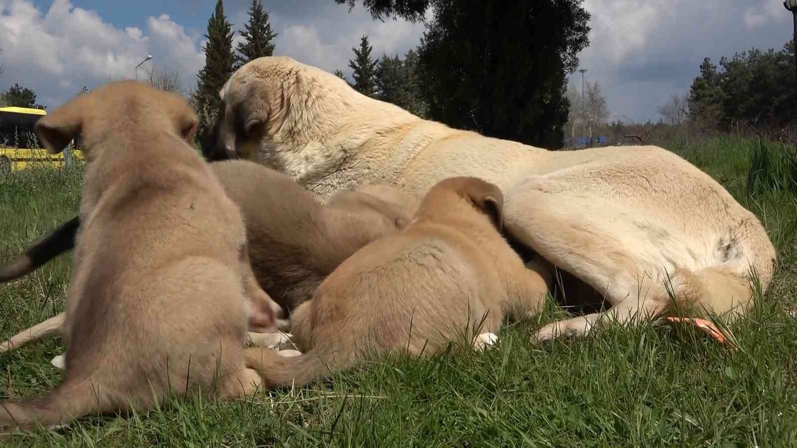 Ağaçların altında yavruları ile yuvarlanan oyunlar oynayan köpek, Veteriner Hekim Elif Ünlü tarafından bulundukları yerde de ziyaret edildi.