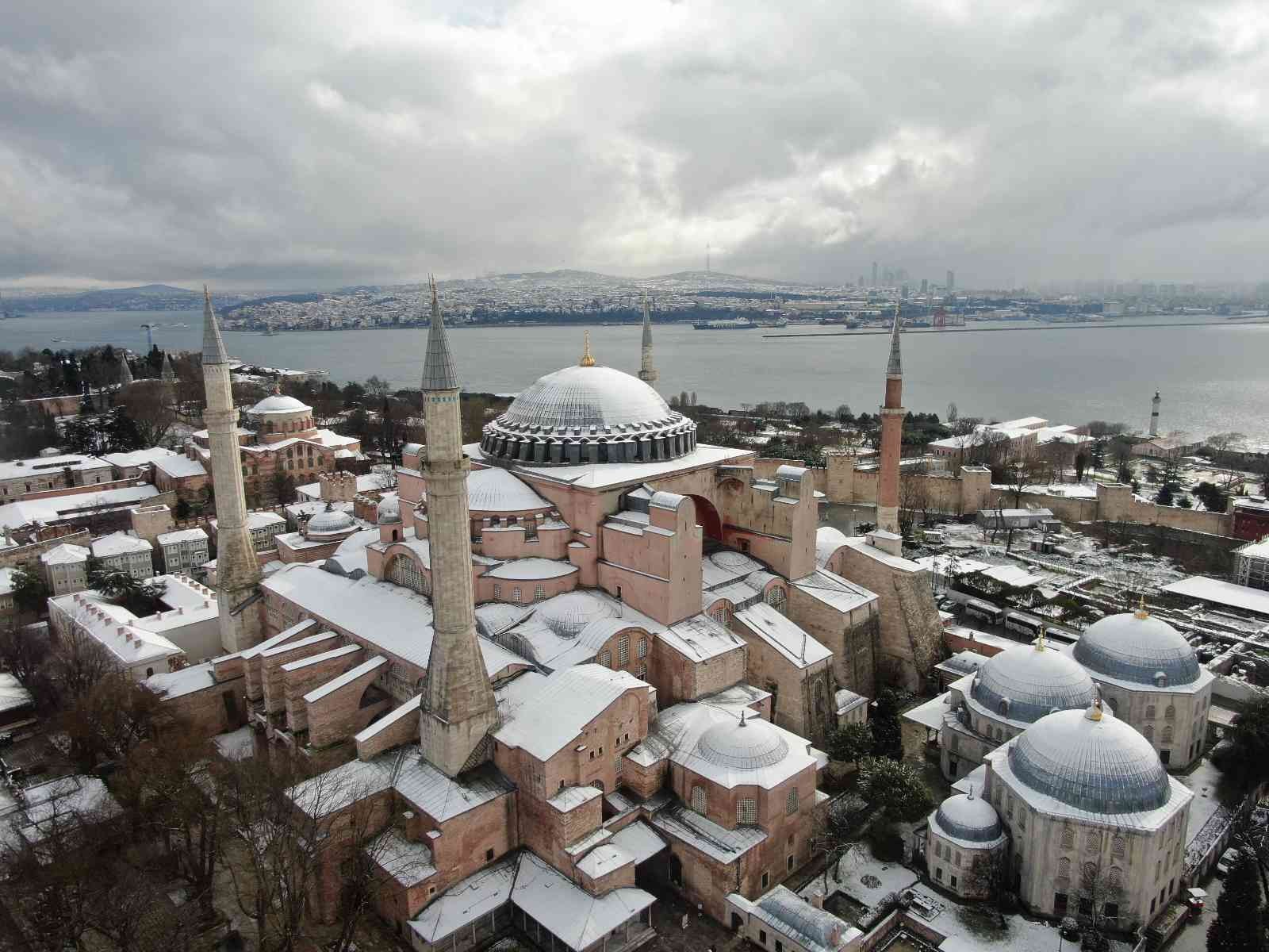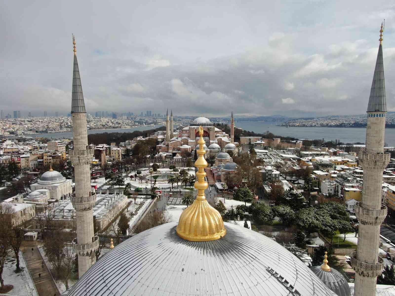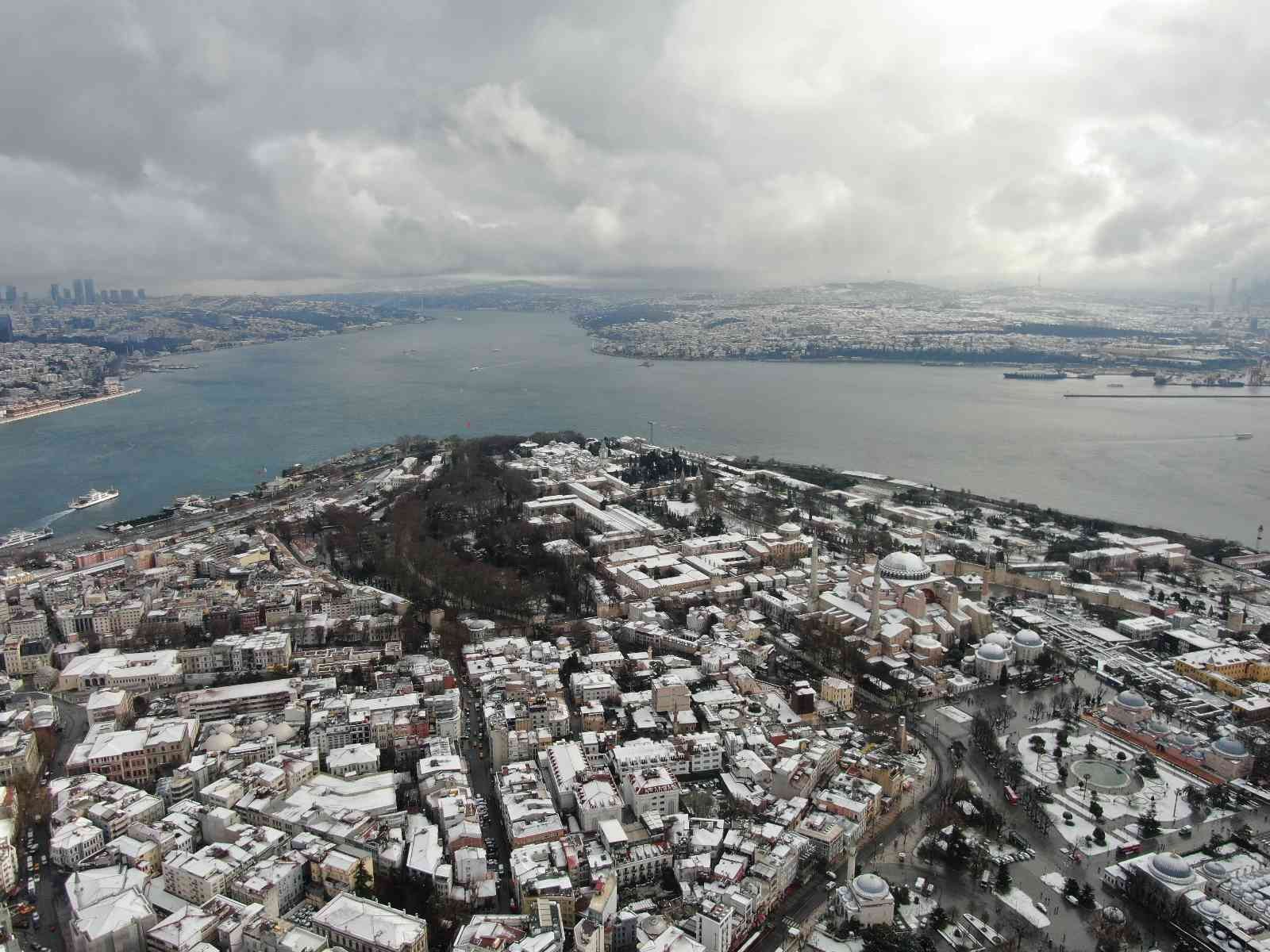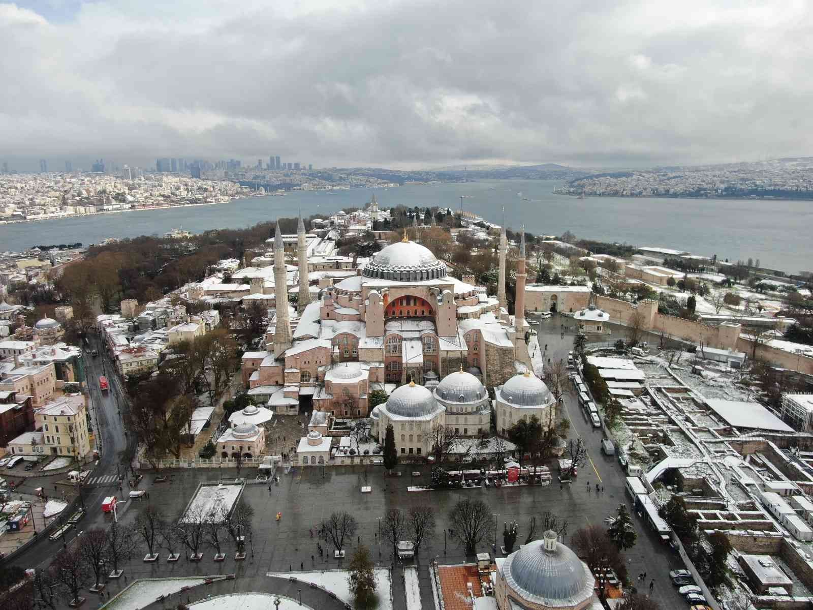 İstanbul’da etkili olan kar yağışıyla tarihi yarımada beyaza büründü. Sultanahmet Camii, Ayasofya-i Kebir Cami-i Şerifi ve Topkapı Sarayı’nı kaplayan beyaz örtü havadan görüntülendi.