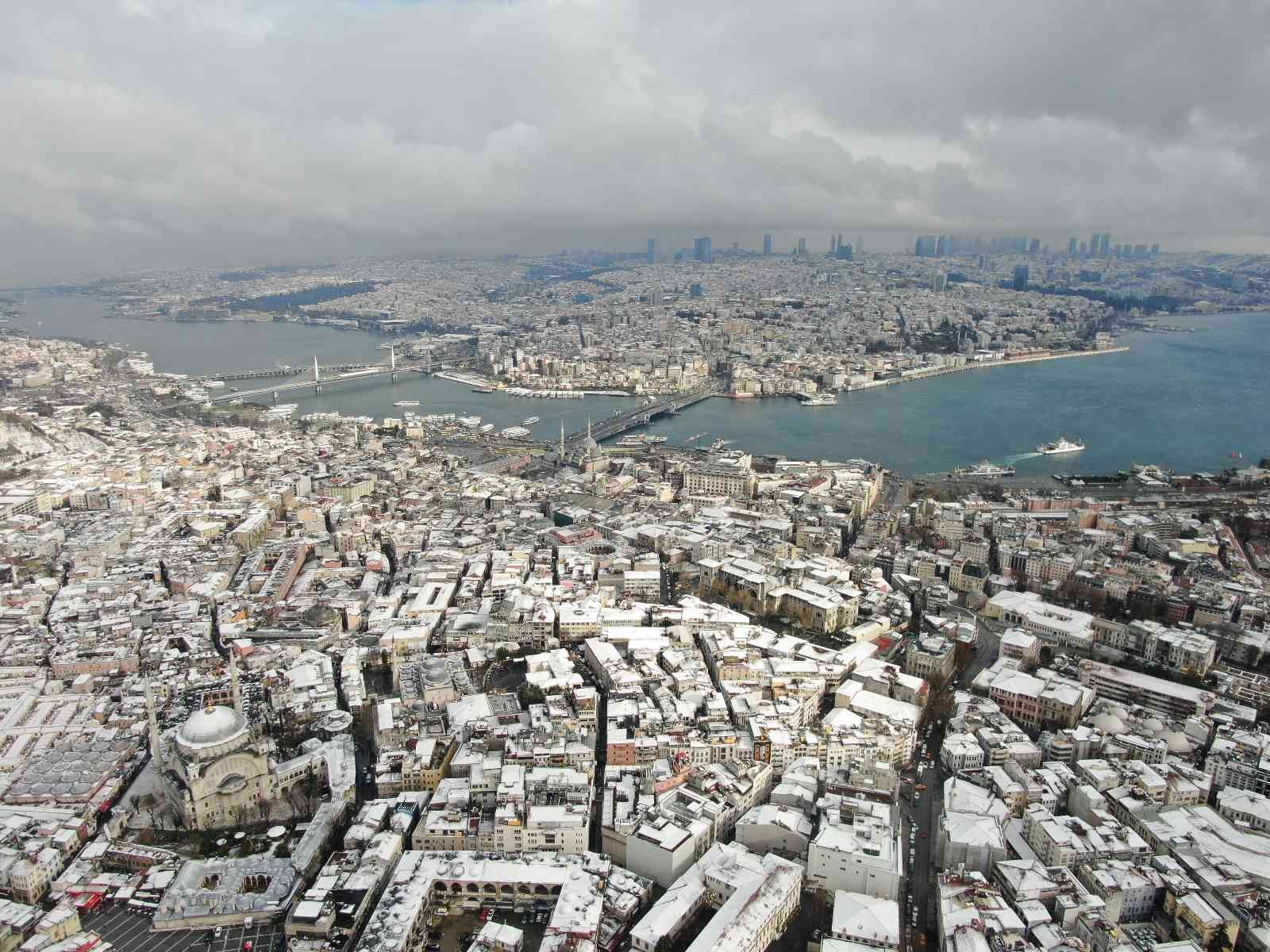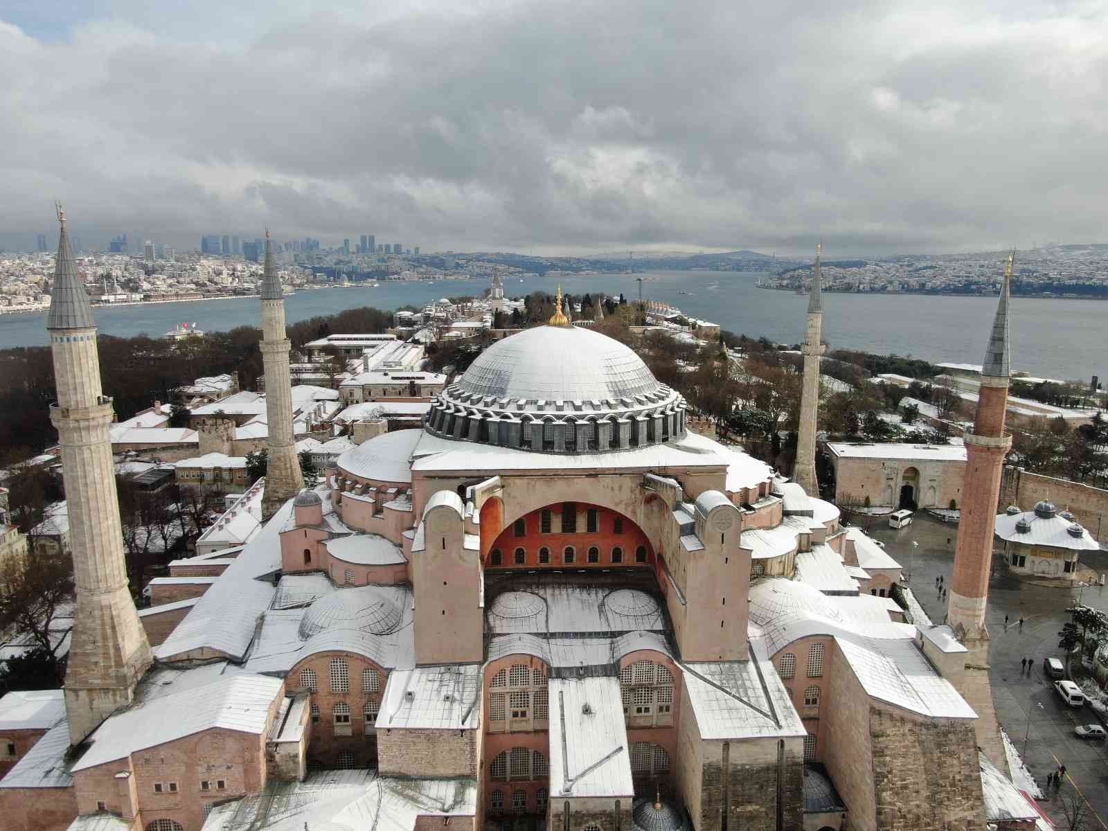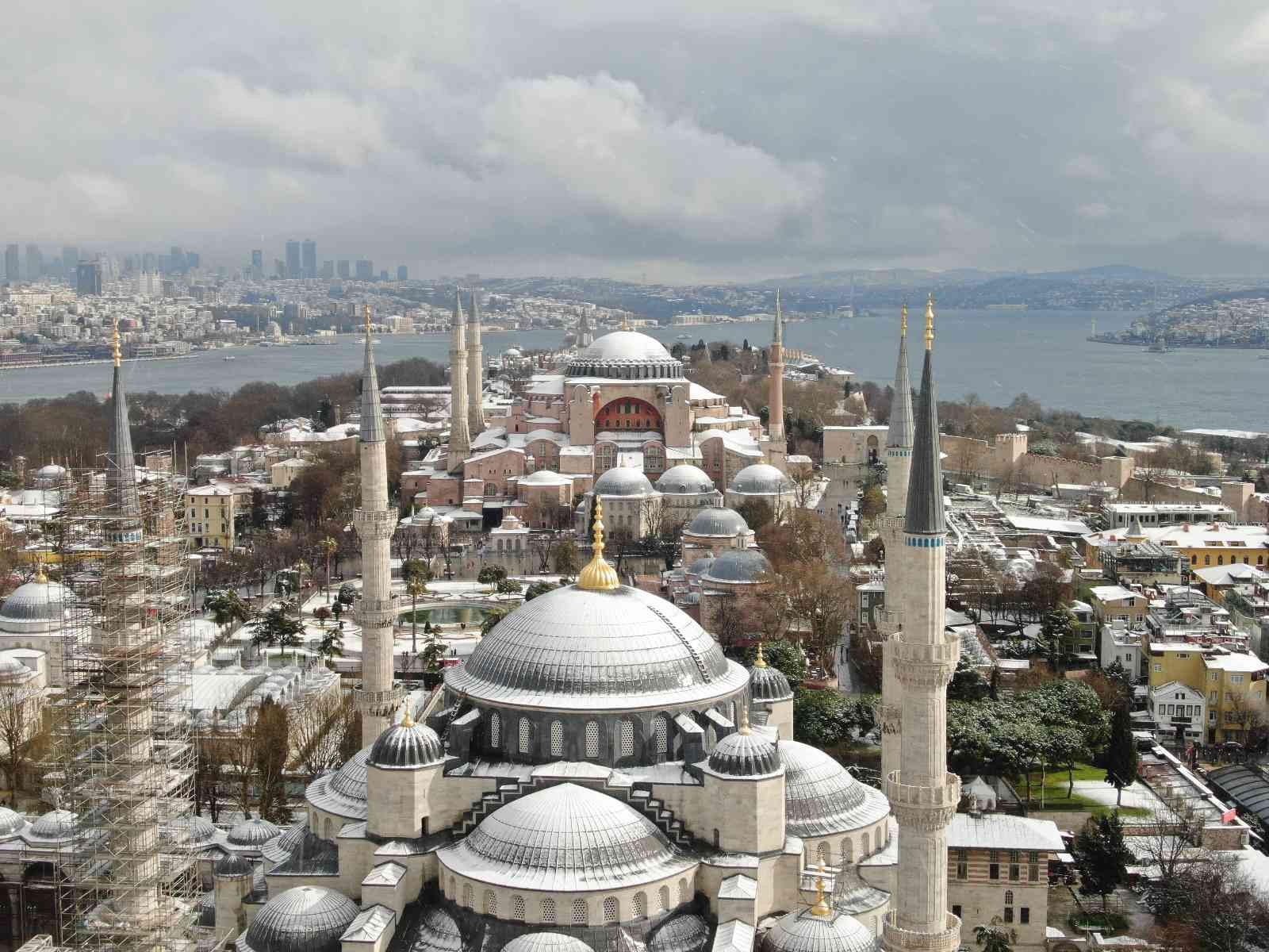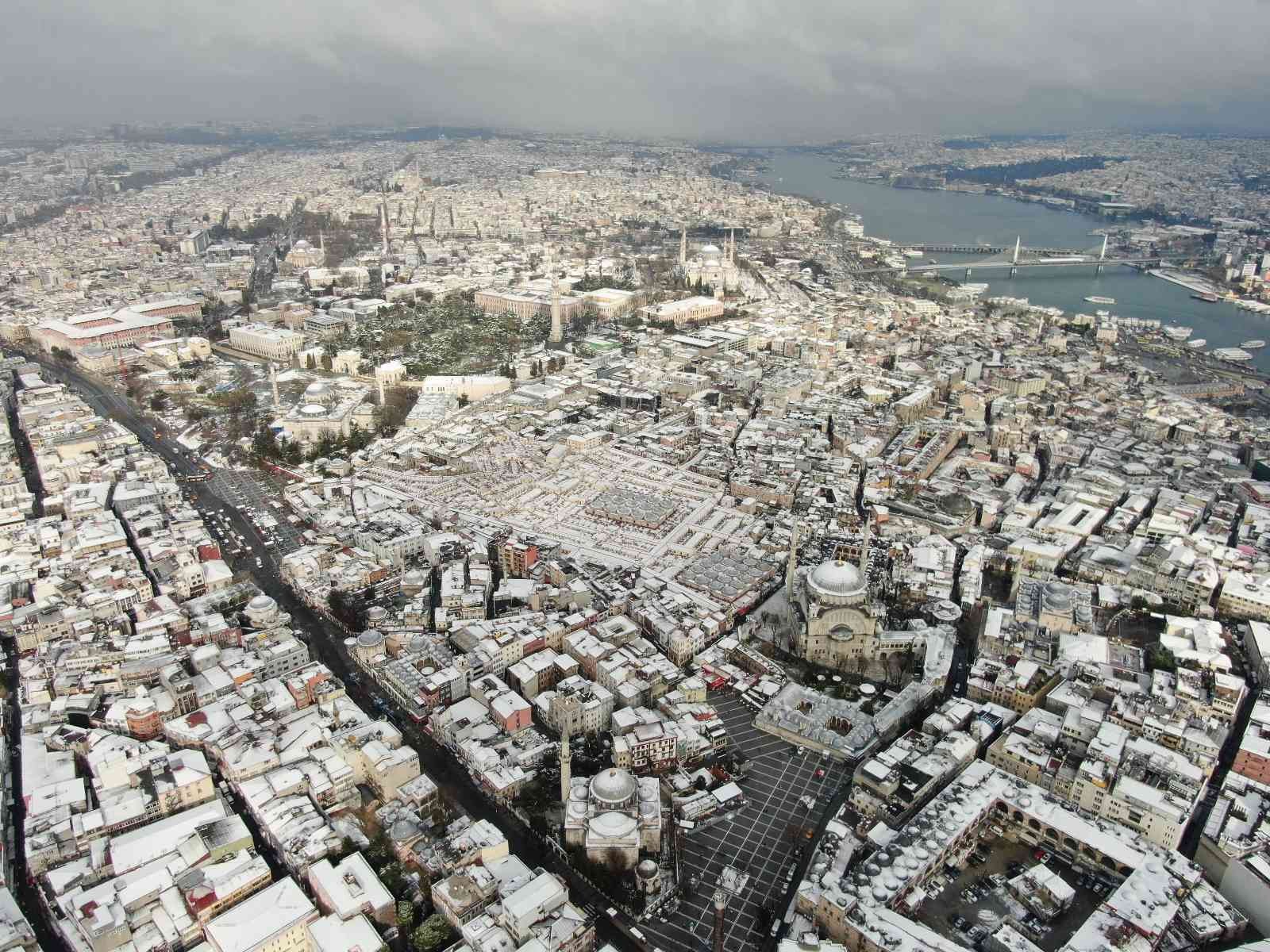 İstanbul’da etkili olan kar yağışıyla tarihi yarımada beyaza büründü. Sultanahmet Camii, Ayasofya-i Kebir Cami-i Şerifi ve Topkapı Sarayı’nı kaplayan beyaz örtü havadan görüntülendi.