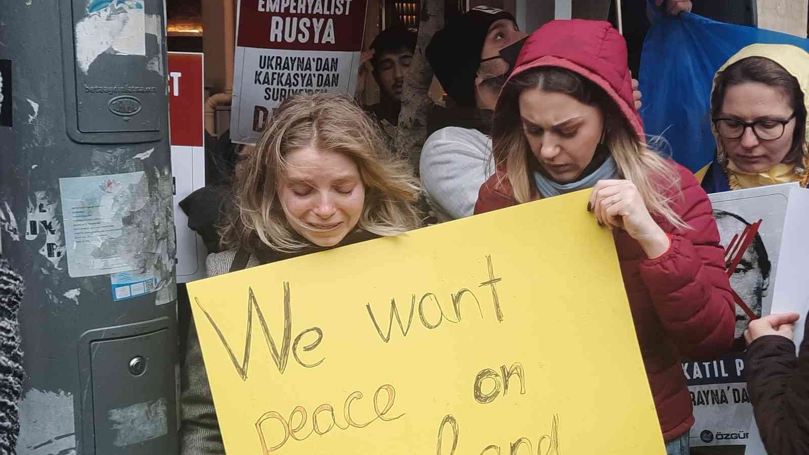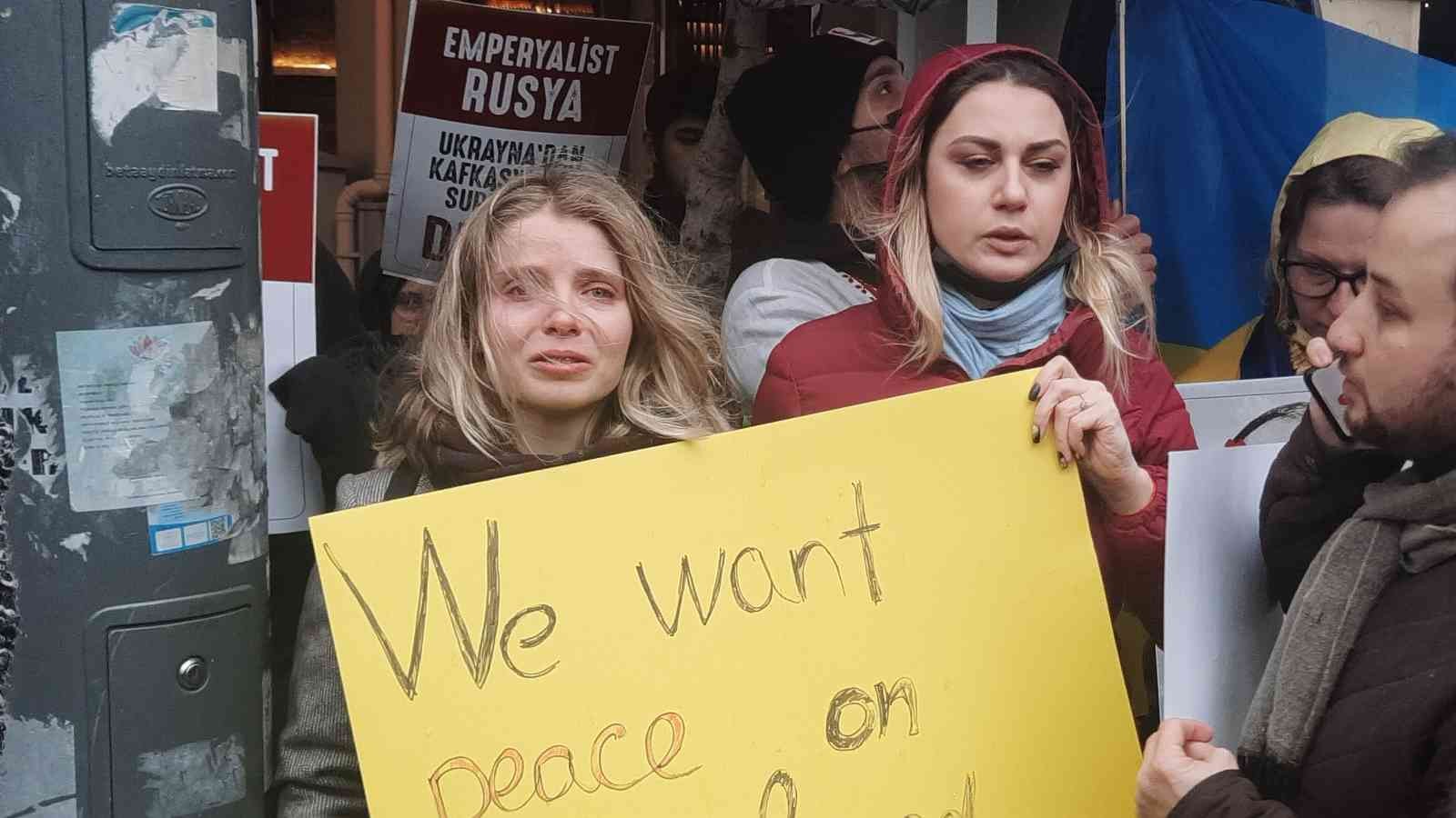 Rusya Konsolosluğu önünde toplanan yaklaşık yüz kişilik grup, Rusya’nın Ukrayna’ya düzenlediği saldırıları protesto etti. Eyleme katılan bir Rus kadın ise, “Rus halkı bu savaşı istemiyor, Ukraynalılar bizim dostumuz” diyerek Ukrayna halkına destek verdi.