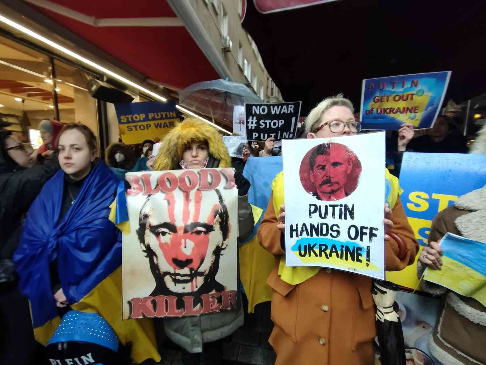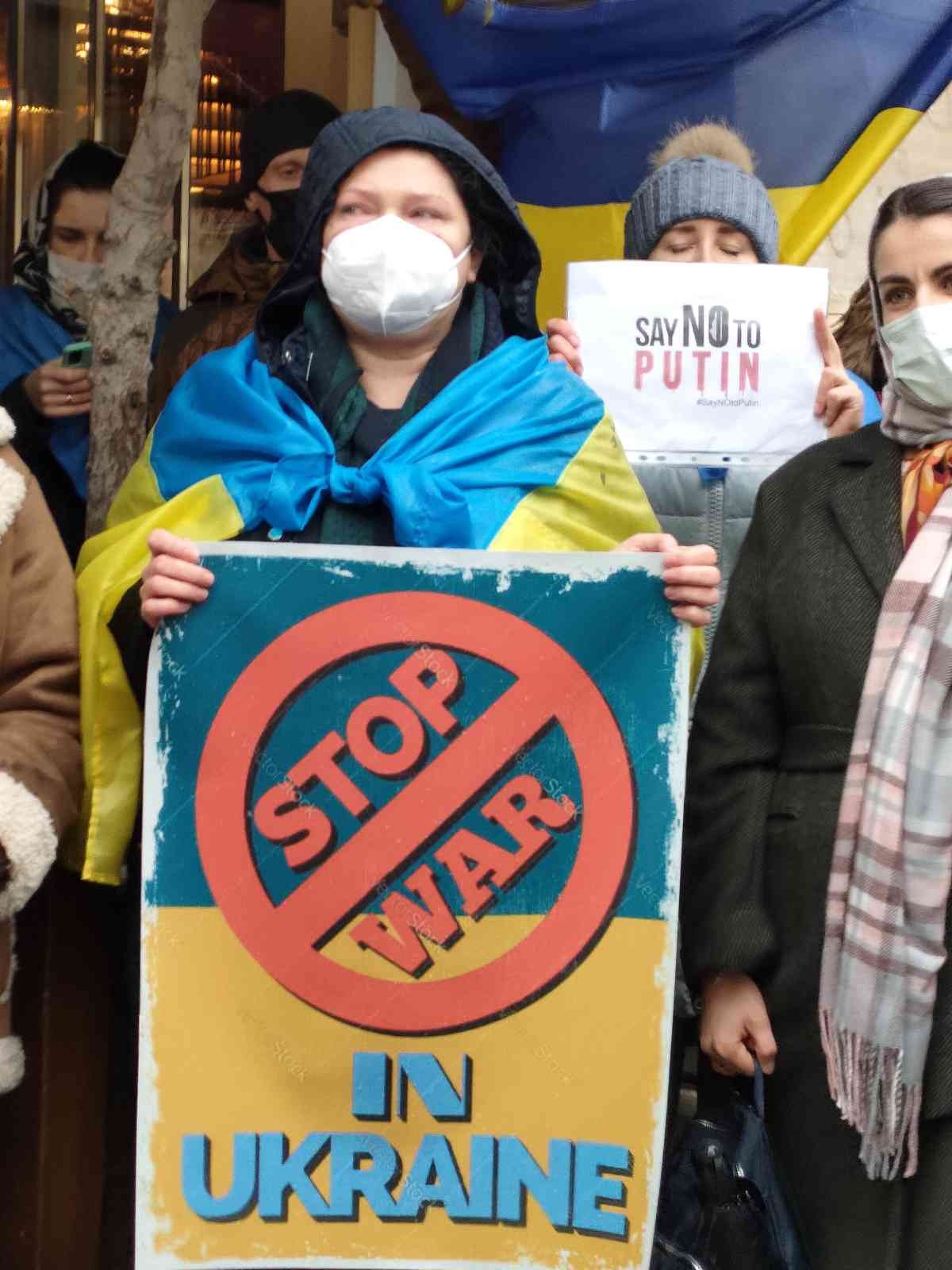 Rusya Başkonsolosluğu önünde toplanan grup adına konuşan Tatyana Özyıldız, “Bugün sabah 04.00’de Rusya, memleketimiz Ukrayna’ya saldırmaya başladı. Uyuyan vatandaşlarımız roketle, tankla, helikopterle vuruldu. Biz buraya savaşı durdurmak için geldik. Üçüncü dünya savaşı başlamıştır. Putin saldırıyor, Putin öldürüyor. Neden herkes susuyor? Biz burada Ukrayna’ya destek vermek için toplandık. Şu an bazen telefonları çalışıyor ama zor haberleşiyoruz oradakilerle. Birkaç şehir vurulmuş. Oradan haber çok zor geliyor. Çok kişi öldü diye düşünüyoruz, çünkü uyuyan şehirleri gece vurmaya başladılar” dedi.