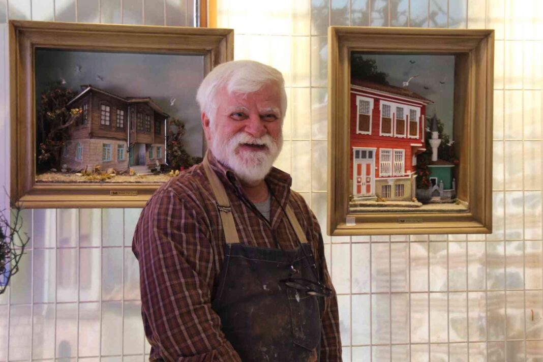 Rölyef tekniğiyle üç boyutlu tablolar yapan Mehmet Erol Buga, aynı zamanda kartondan ve ahşap malzemelerden birbirinden güzel minyatür evler yapıyor.